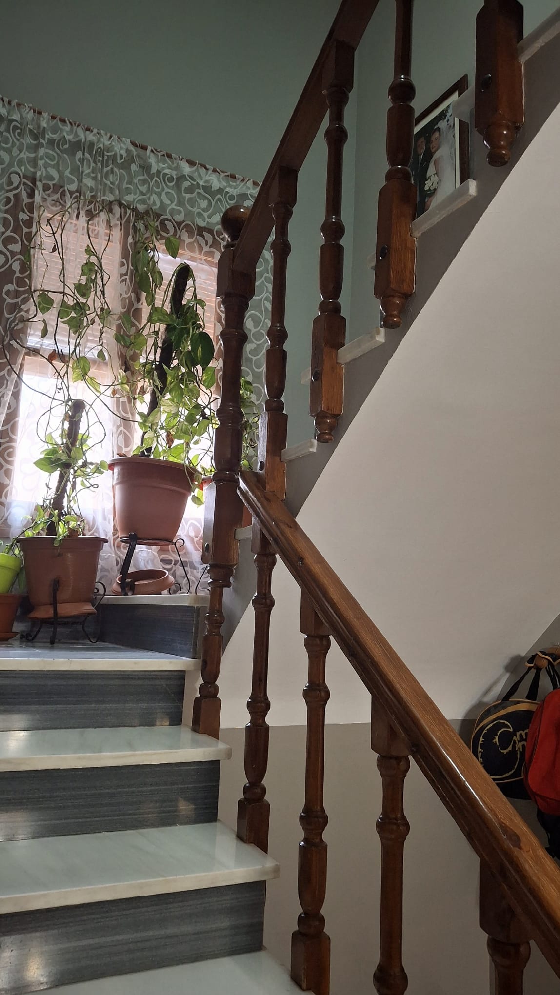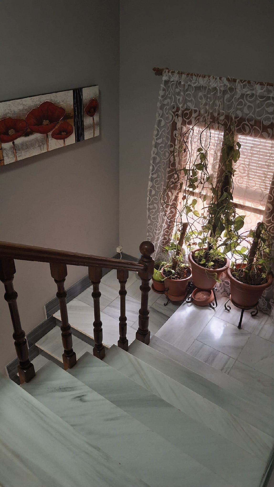 Desde el espacioso hall arrancan unas elegantes escaleras de mármol con baranda de madera que conducen a la planta alta.